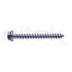 Parafuso em aço carbono com acabamento galvanizado e cabeça sextavada flangeada nº10. Conjunto de vedação composto por arruela metálica côncava galvanizada e arruela polimèrica flexível.
